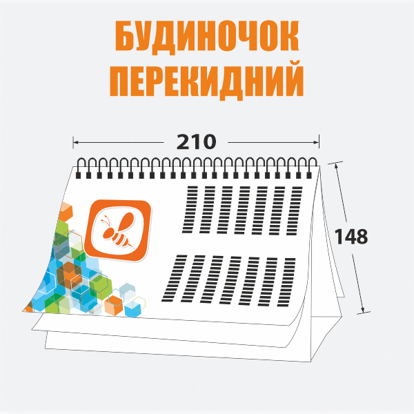 Перекидний календар будиночок горизонтальній орієнтації скріплений на 1 пружину. Має обкладинку, 12 аркушів календаря і підкладку / основу «будиночок». Двостороння кольоровий друк. Підкладка може бути з щільного картону або щільного паперу. Листи з датами виконані з матового паперу, що дозволяє робити на них позначки. Має більший розмір, ніж календар з вертикальною орієнтацією. Що дозволяє розмістити на ньому більше інформації. Дуже добре підходить в ролі настільного аксесуара. Даний календар може бути виконаний з наданого Вами макета або ми можемо розробити макет календаря спеціально для Вас.